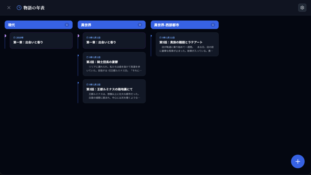 • キャラクターごと・場所ごとなど、視点を変えた時系列管理が可能です